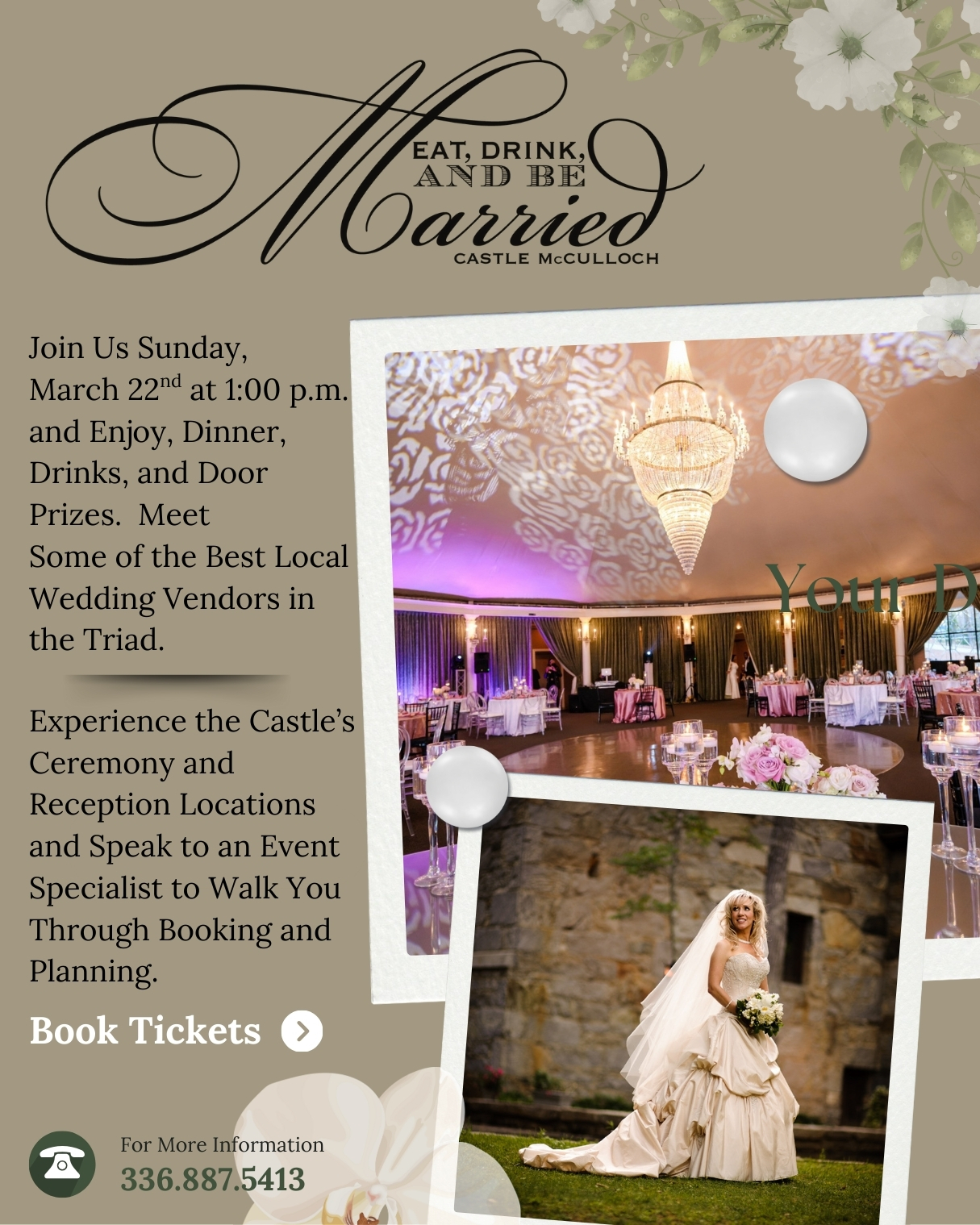 Visit Castle McCulloch, North Carolina’s ONLY Genuine Castle & Have a Chance to Win Our Grand Prize ~ A Carnival Cruise! Our Bridal Show Specials Are: 10% Off Your Room Rental or a Free Patio (You Choose) and We have Additional Discounts For Our Intimate Weddings. In Addition To Strolling The Grounds Of The Castle, You Get The Chance To Meet Our Vetted, Hand Picked Selection Of Wedding Professionals From Multiple Wedding Vendor Categories. Enjoy Cocktails While Tasting Our Deliciously Prepared Foods From Our Selection Of Wedding Bakers And Caterers. Register to Win 1 Of Many Door Prizes! Online Registration Is Open For Brides To Register. All Guest Tickets ($15.00) Will Be Available For Purchase Online Or At Check In At The Event. Located In Jamestown, The Castle Is Only 10 Minutes From Greensboro, 15 Minutes From Winston Salem, And One (1) Hour From Raleigh & Charlotte. Be Sure To RSVP Quickly For This Extraordinary Bridal Show! Spaces Fill Quickly, So Register Now To Secure Your Spot!